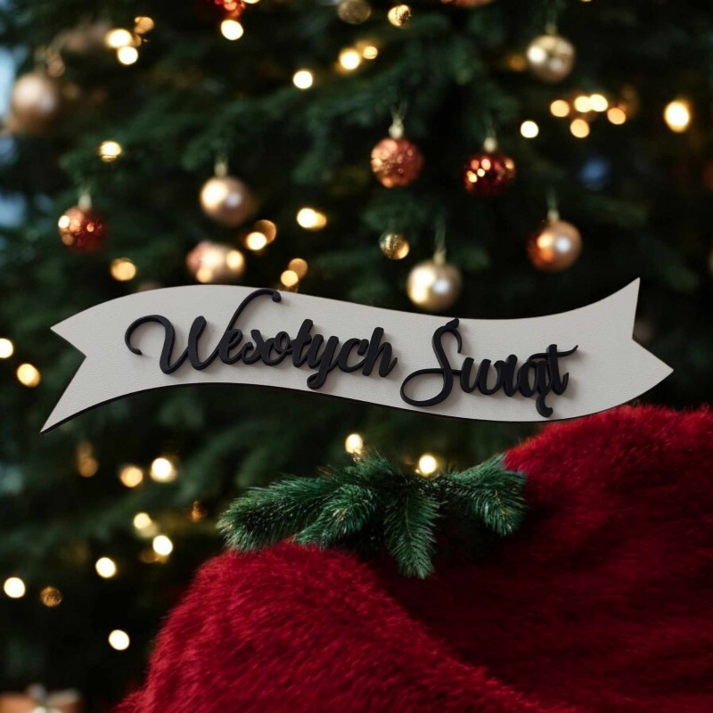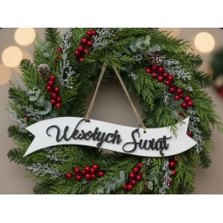 Tabliczka z wypukłym napisem Wesołych Świąt na wianek świąteczny.