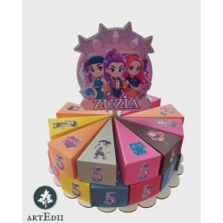Jedna pełna warstwa tortu składa się z 13-15 pudełek wykonanych z wysokiej jakości papieru kolorowego 160-250g sztywny, ozdobiony postaciami z wybranej bajki wydrukowany na papierze błyszczącym fotograficznym i precyzyjnie wycięty.
